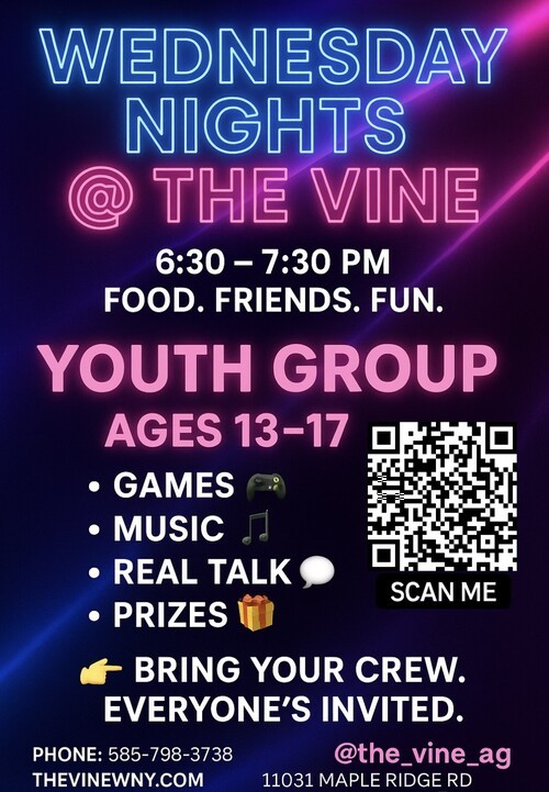 Join us Wednesday Nights at 6:30pm for youth group! We are so excited to introduce our new Vine Youth Group! Enjoy games, music, and real talk.
